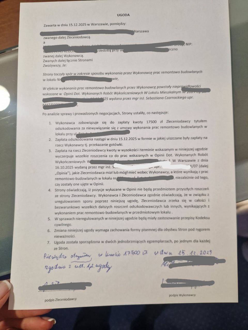 Klient potrzebował pomoc prawna oraz wstępna konsultacja, ponieważ remont mieszkania został wykonany z naruszeniami i nie odpowiadał ustaleniom ani oczekiwanej jakości. Po zakończeniu prac wykryto wady, których usunięcie wymagało dodatkowych kosztów. Wykonawca unikał odpowiedzialności albo proponował rozwiązania, które nie pokrywały realnych strat klienta. Głównym celem klienta było odszkodowanie oraz ochrona praw w możliwie krótkim czasie, bez przedłużającego się konfliktu.