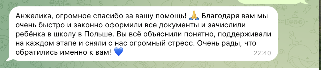 This case demonstrates that professional support allows families to avoid stress, loss of time and errors in documents. This creates stable conditions for the child's integration into the new educational environment and ensures a confident start to the educational process in Poland.