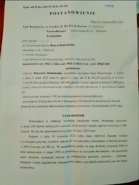Клієнт звернувся з проханням допомогти у ситуації, коли на нього було накладено судовий штраф і судовий збір на загальну суму 12 700 зл, що стало відчутним фінансовим навантаженням і було складним для одноразової сплати. Основне завдання — знайти законний механізм, який дозволить уникнути негайної повної оплати та розподілити суму на прийнятні платежі.